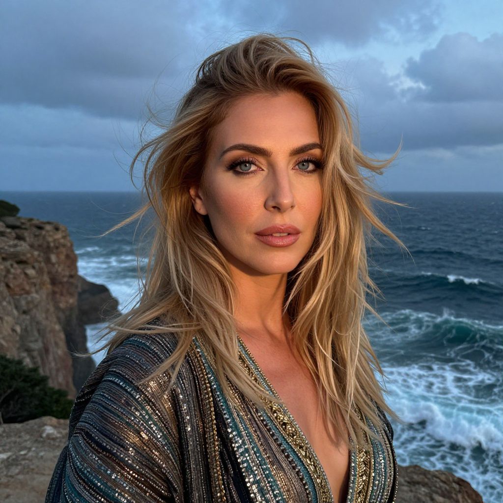 Photograph of a blonde woman with tousled hair and blue eyes, standing on a rocky cliff by the ocean. She wears a shimmering, silver-gray, V-neck top adorned with sequins. Her makeup is glamorous with defined eyebrows, dark eyeliner, and nude lipstick. The background features a cloudy sky and the deep blue ocean with white waves crashing against the rocks. The lighting highlights her face and hair, creating a dramatic, sunlit effect against the darker sky and sea.