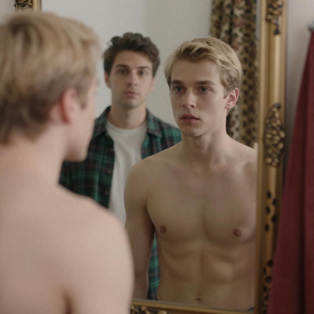 Photograph of two shirtless men standing in a dimly lit room. The man on the left has short brown hair, a muscular build, and is smiling, while the man on the right has dark hair, a slightly less muscular build, and is holding a black garment. A lamp with a white shade is on a table in the background.