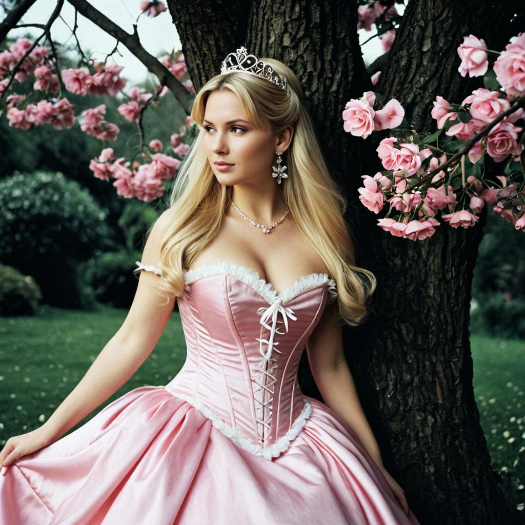 Purple magician costume,1girl, hat, solo, dress, necklace, jewelry, tree, long hair, brown hair, bare shoulders, corset, outdoors, breasts, realistic, flower, purple headwear, purple dress, cherry blossoms, standing, looking at viewer, walking