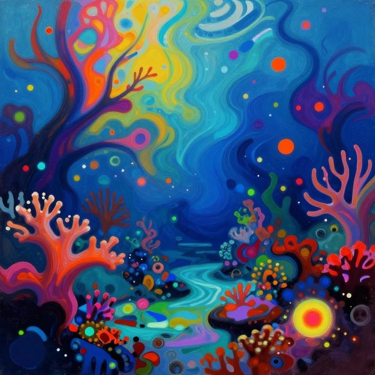 Envision a mesmerizing underwater realm where vivid hues and abstract forms dance together in harmony, reminiscent of Kandinsky's ethereal brushstrokes but viewed through the eyes of an aquatic observer gliding through a vibrant coral kingdom. This enchanting tableau showcases luminescent geometric shapes that meld seamlessly with the thriving marine ecosystem, evoking a sense of serenity that gradually builds into awe as these living forms intermingle with the natural splendor beneath the waves. The resulting visual tapestry is a captivating fusion of artistry and nature, inviting viewers to immerse themselves in an otherworldly seascape where the boundaries between abstraction and reality blur in a breathtaking display of color and form.