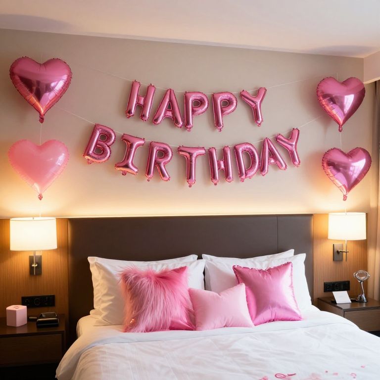 Photograph of a cozy bedroom decorated for a birthday celebration. The focal point is a bed with white linens, topped with three pink satin pillows and a fluffy pink pillow. Above the bed, "HAPPY BIRTHDAY" is spelled out in shiny pink heart-shaped balloons. Two additional pink heart balloons are hung on either side. The headboard is dark brown, and two modern wall-mounted lamps with white shades flank the bed. A small table with a pink tissue box and a glass is on the left side. The wall is beige, and the overall ambiance is warm and festive.