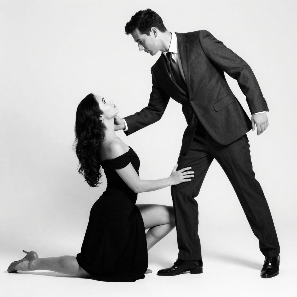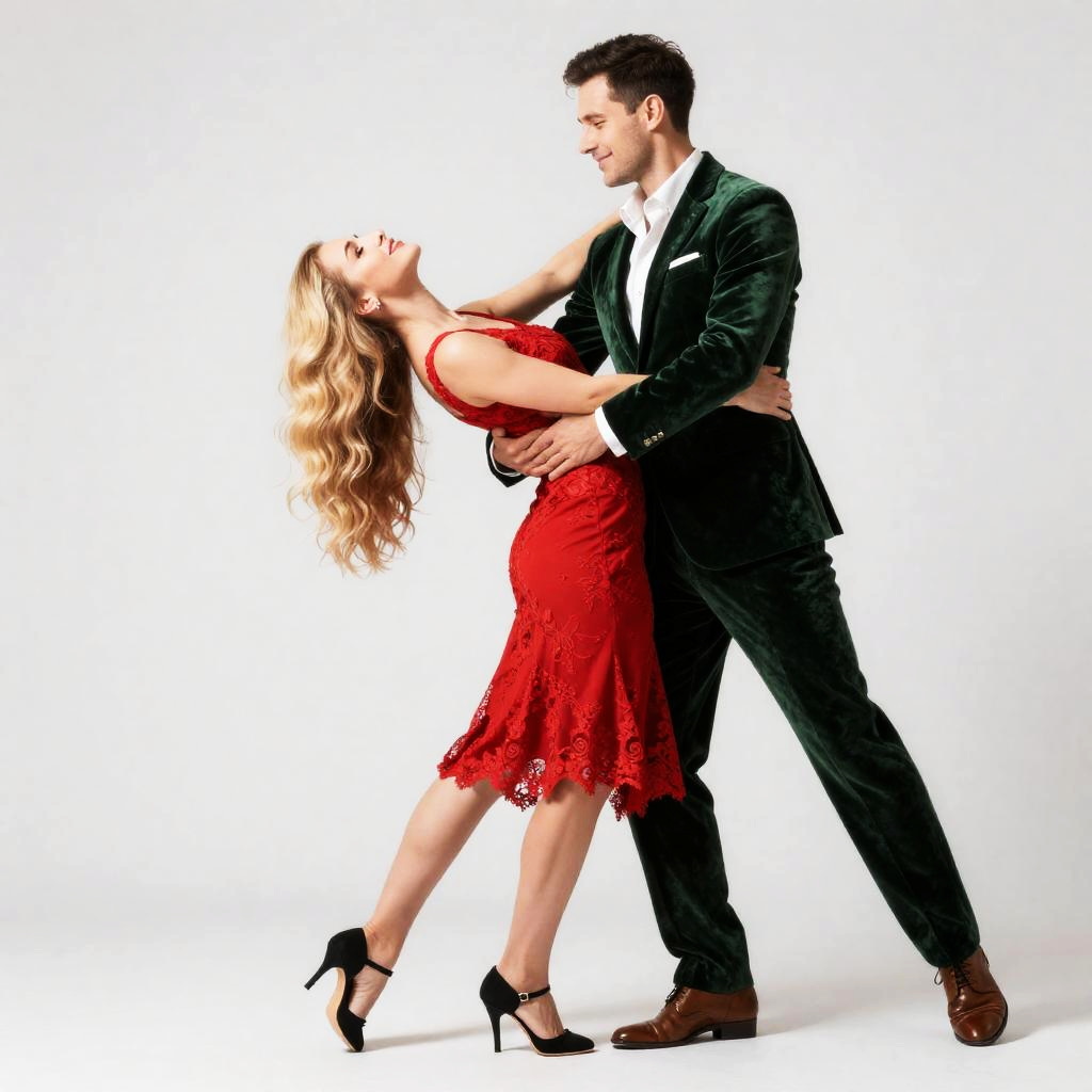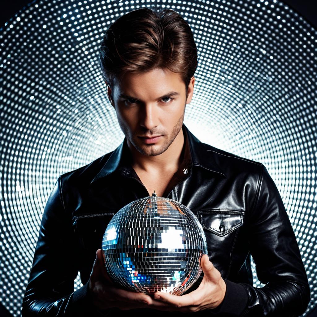 Photograph of two people in a psychedelic room. Blonde woman in sequined, silver dress and black gloves dances to the left. Man in black suit with raised arms stands to the right. Green spiral patterned background. Door in center.