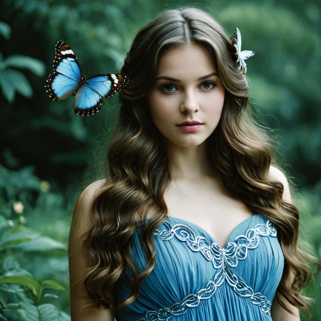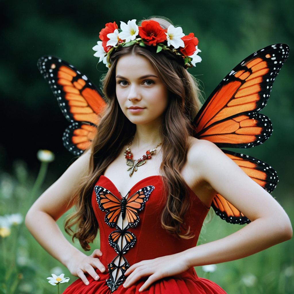 Adult fairy dress costume,1girl, solo, wings, dress, brown hair, fairy, flower, fairy wings, long hair, realistic, head wreath, tree