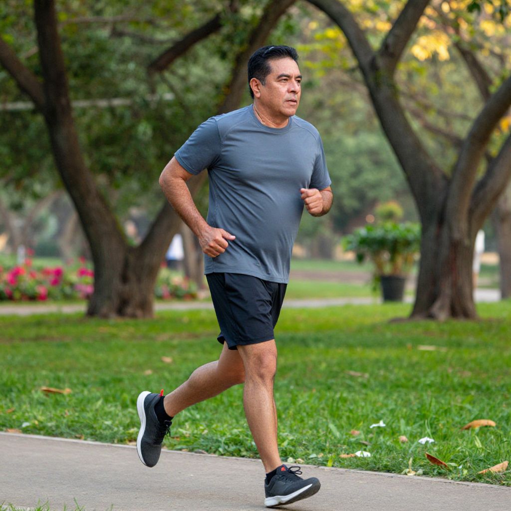 Photograph of a middle-aged Asian man jogging in a park, wearing a gray t-shirt, black shorts, and black sneakers, with trees and green