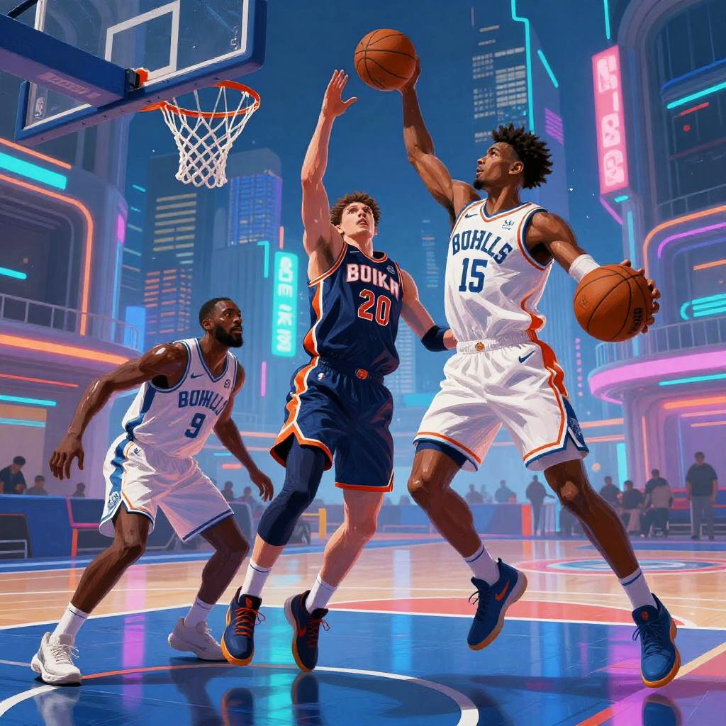 NBA AI art featuring dynamic basketball players in futuristic urban arenas, neon lights highlighting intense action, digital brushstrokes blending sports and technology, vivid colors