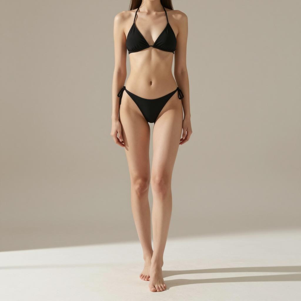 A slender woman wearing a black bikini, standing barefoot on a smooth floor against a plain beige background, minimalist fashion style, natural lighting casting soft shadows, muted beige and black color tones, clean and simple composition