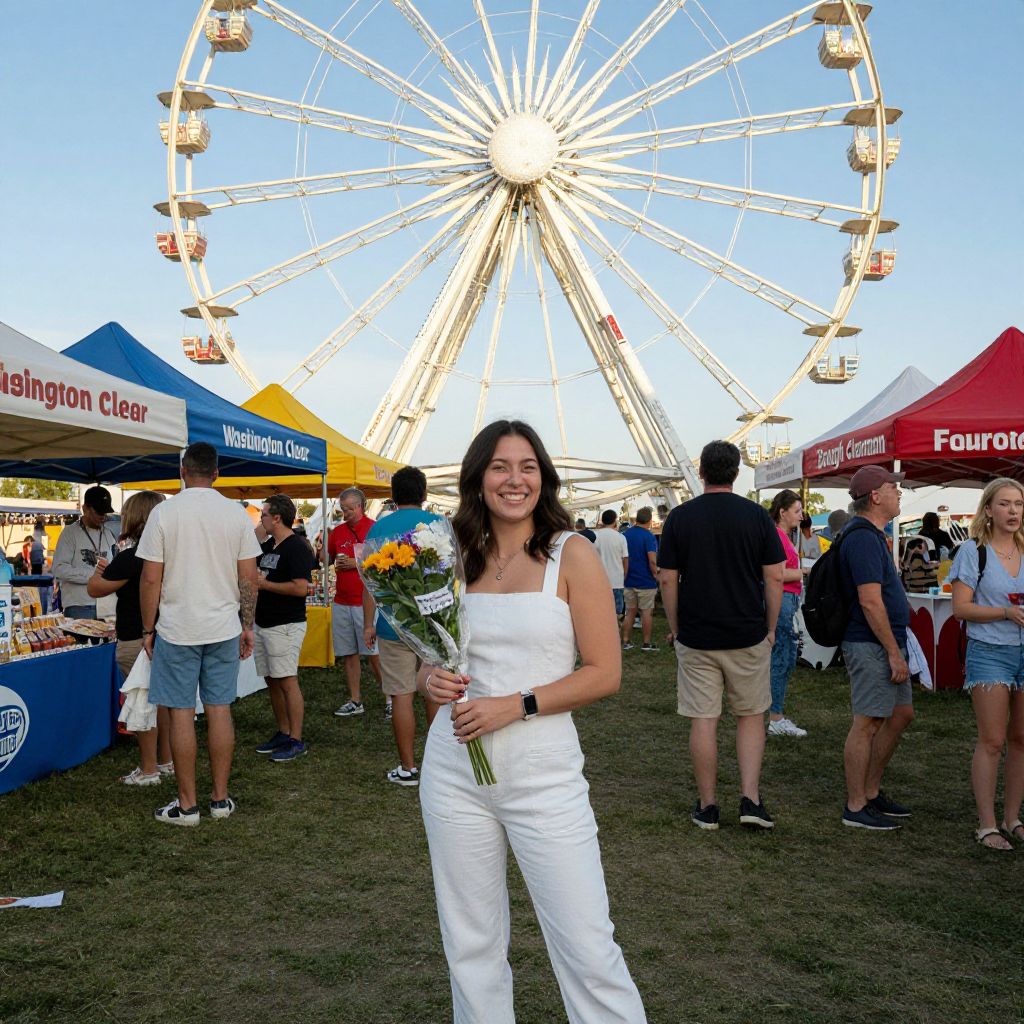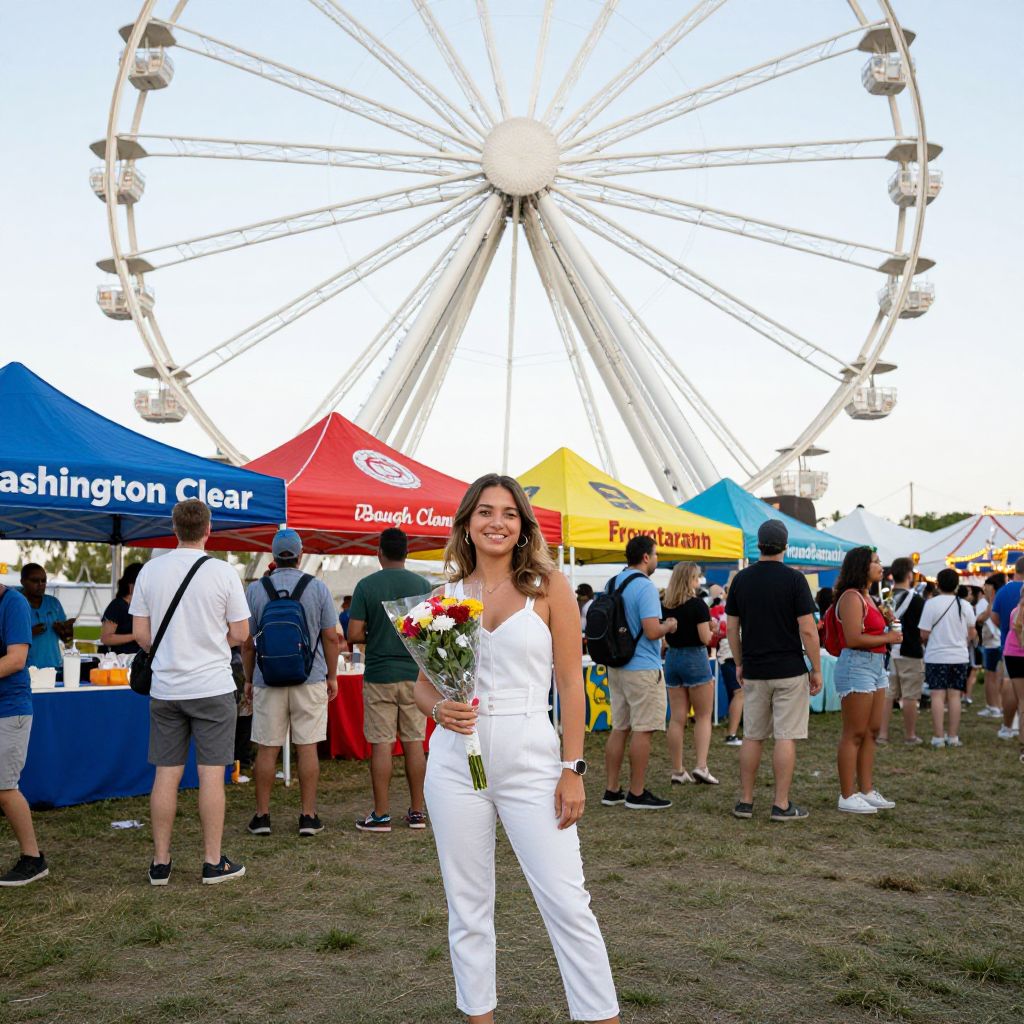 Lively fairgoers gather beneath a towering Ferris wheel as a woman in a white jumpsuit smiles brightly, holding a bouquet of flowers, while colorful vendor tents labeled \"Washington Clear,\" \"Baugh Claman,\" and \"Frorotarahn\" line the bustling midway.