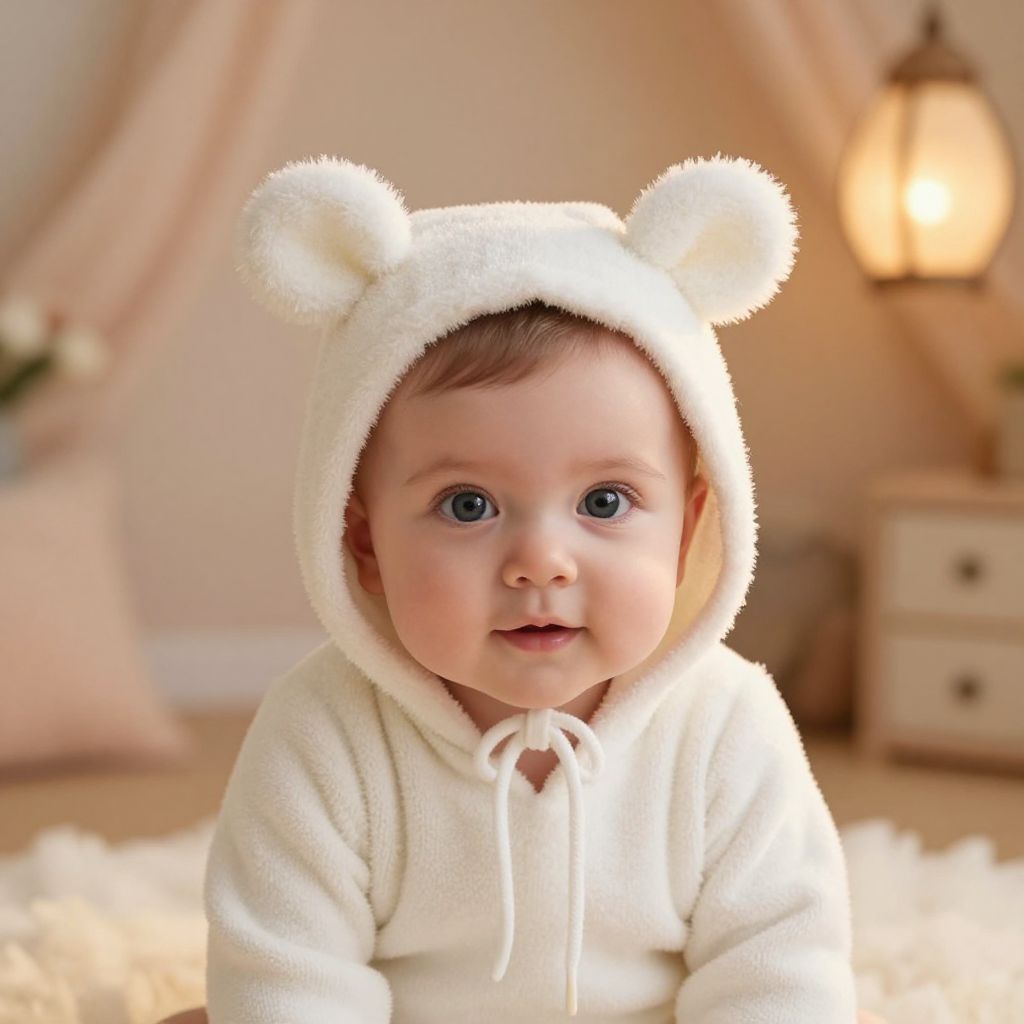 A cute baby with soft, fluffy white ears that gently poke out from a cozy, hooded white outfit, the ears adding a playful and endearing touch. The baby has large, warm blue eyes that gaze directly at the camera with a sweet, curious expression, exuding innocence and charm. The baby's face is gently illuminated by soft, golden indoor lighting, creating a cozy and magical atmosphere. The background features a warm, gently furnished room with muted pastel tones, a fluffy rug, and subtle decorative elements like hanging lanterns and soft fabric drapes, enhancing the serene and inviting ambiance. The overall mood is tender, peaceful, and full of childhood wonder.