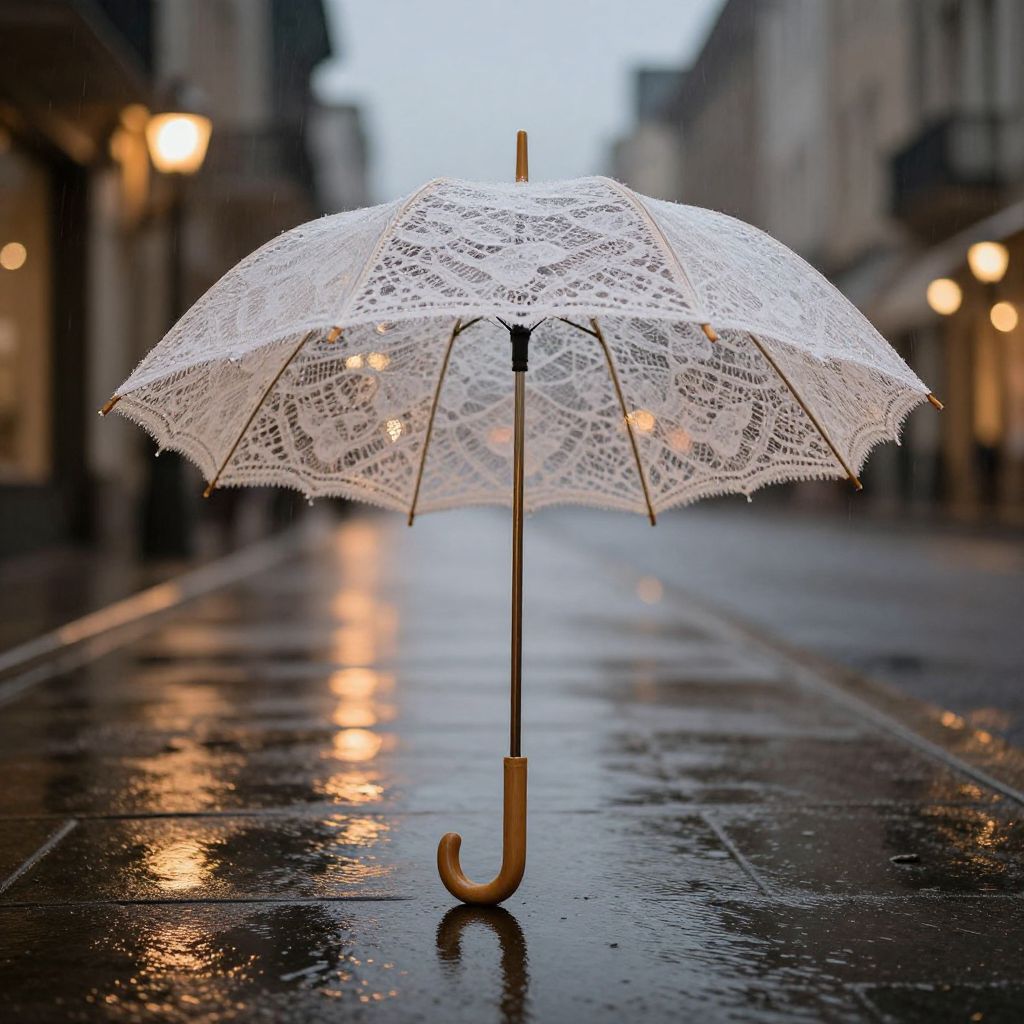 Elegant umbrella standing open in a gentle rain, intricate lace patterns on the canopy, soft glowing city lights reflecting on wet pavement, a sophisticated vintage street scene, dusky evening ambiance, high detail and warm color tones