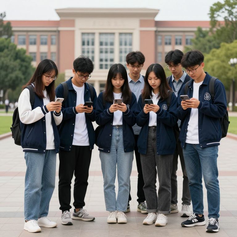 Embroidery Monogram students looking at smartphones while casting spells. full body group shot. background university.,