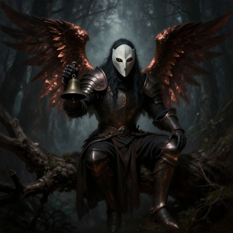 Oriental Art High detail oil art, middleshot , gothic male in mask with blazing eyes, sit on branch, behind his back copper wings, creepy dark forest, dressed in gothic armor, in his hand bell, mist,