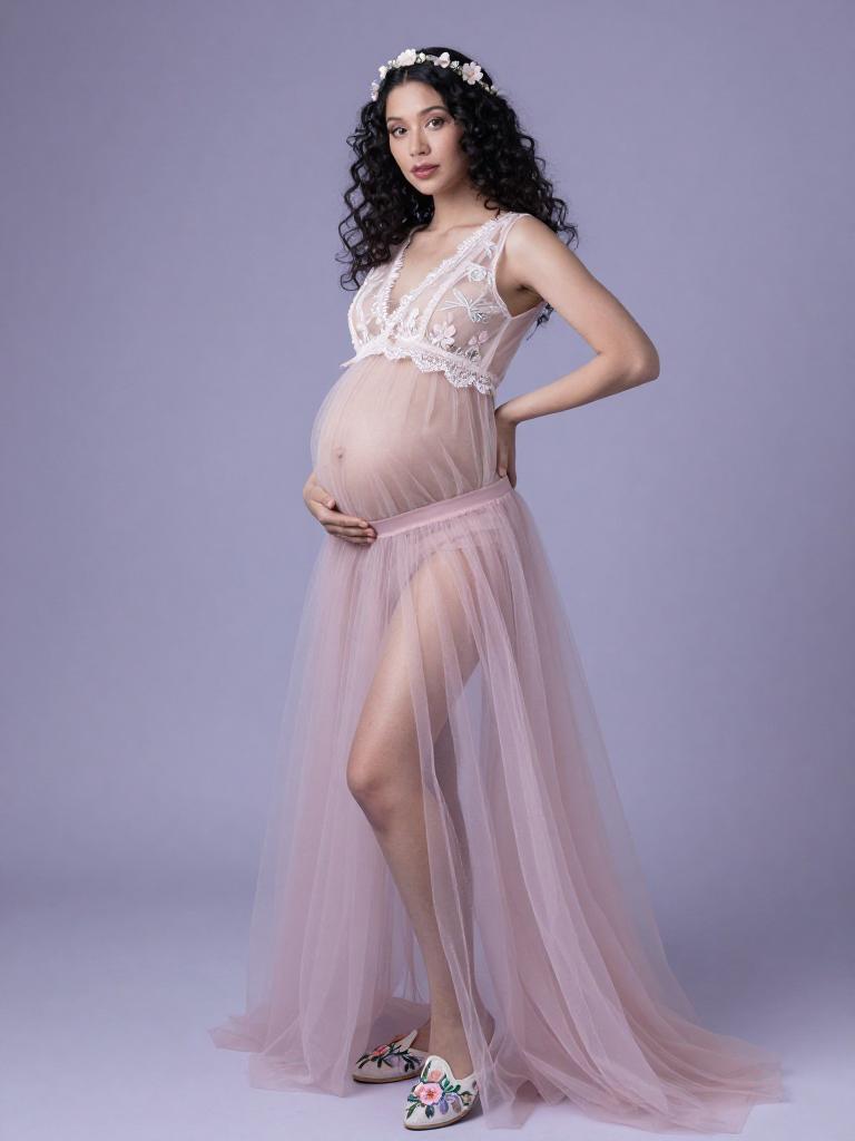 Pregnant fashion outfit, confident expecting mother with curly black hair in a loose natural style and pear-shaped maternity silhouette with accentuated hips and bump, dressed in a fairy outfit, whimsical ethereal style, wearing sheer lace maternity blouse with embroidered flowers with flowing tulle maternity skirt cascading to the floor and embroidered slip-on flats, floral headband, minimalist fairy look with clean, dreamy lines, standing in misty lavender-toned backdrop studio background, soft dreamy lighting, high-end maternity fashion photography, ultra-detailed