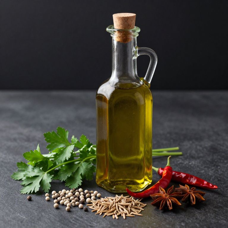 Photograph of a clear glass bottle with a cork stopper filled with golden olive oil, standing on a dark gray textured surface. Surrounding the bottle are fresh green cilantro leaves, red chili peppers, whole black peppercorns, brown star anise, and light brown cumin seeds. The background is a solid black, emphasizing the vibrant colors of the ingredients and the transparency of the oil. The composition is centered and neatly arranged, highlighting the natural ingredients and the glass bottle.