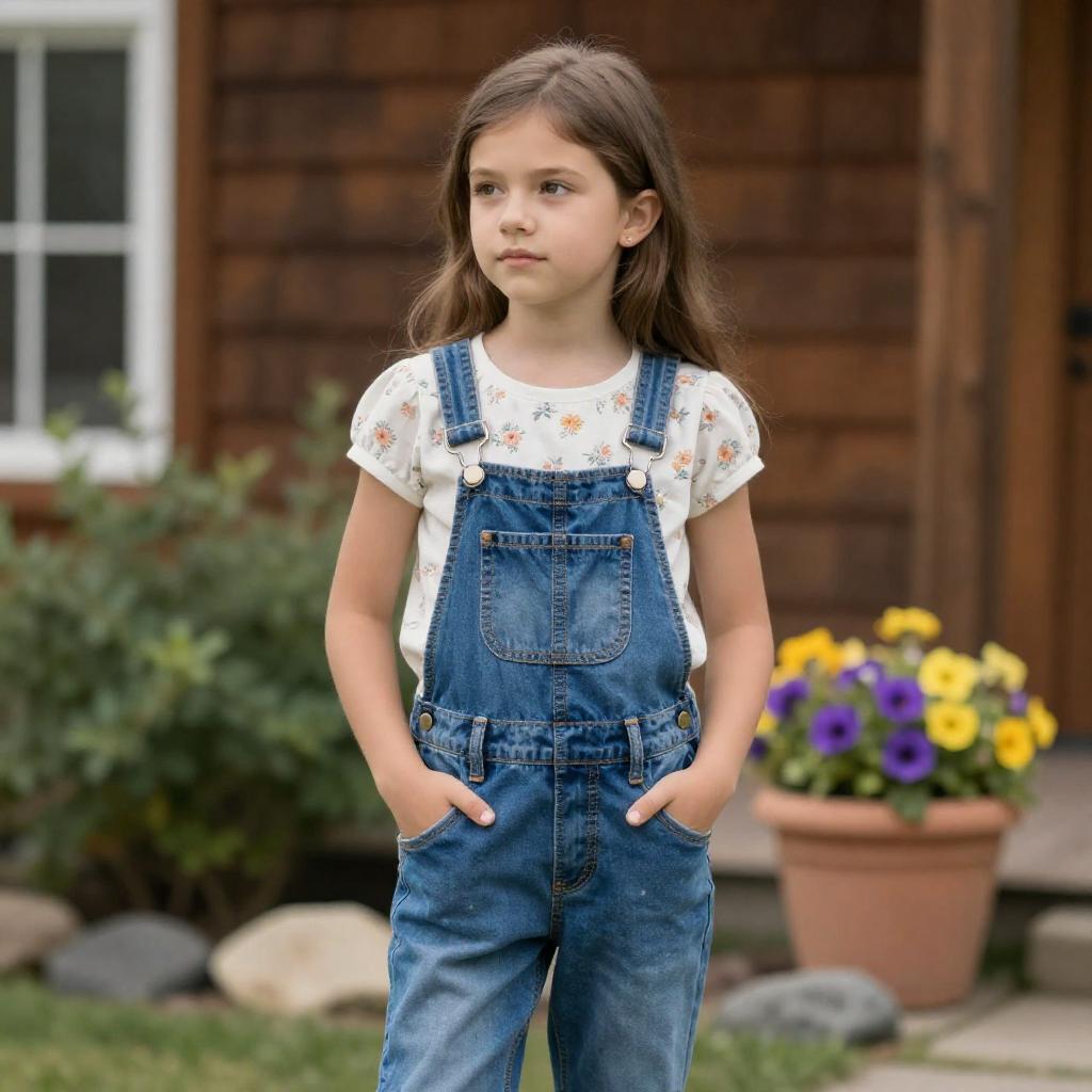 Young girl with curly brown hair, wearing a green vest over a striped shirt, looks to the right, standing behind a chain-link fence with green leaves. Two metal bars cross in front. Dark, industrial background.