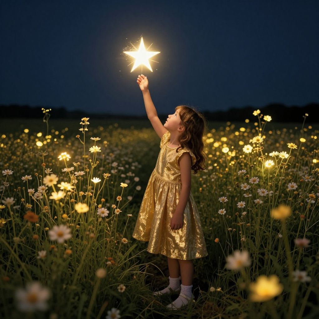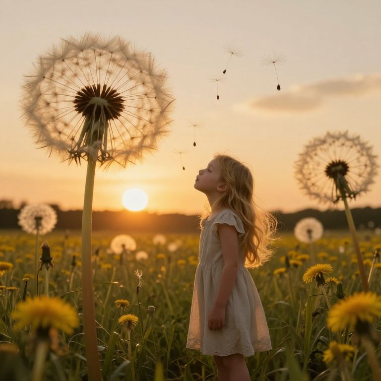 A young girl with cascading golden locks stands within an expansive meadow adorned with oversized dandelions, their petals glowing in radiant shades of gold and amber under the warm glow of the setting sun. Captured from a low vantage point akin to a 'bug's-eye view', she tenderly exhales upon one of these colossal dandelions, causing a cascade of iridescent seeds to dance through the air. This enchanting tableau embodies a blend of ethereal imagination and whimsical fantasy, evoking a sense of wistful nostalgia and introspective melancholy that beckons viewers into a dreamlike realm reminiscent of the painterly visions of a revered artist, yet imbued with a touch of surrealistic allure.