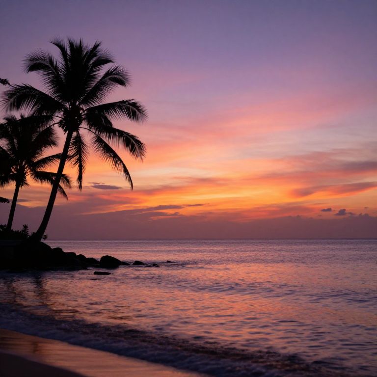 Beautiful sunset over a calm ocean, vibrant hues of orange, pink, and purple reflecting on the water, silhouetted palm trees gently swaying, soft waves creating a peaceful and serene atmosphere, ultra-realistic style, cinematic lighting
