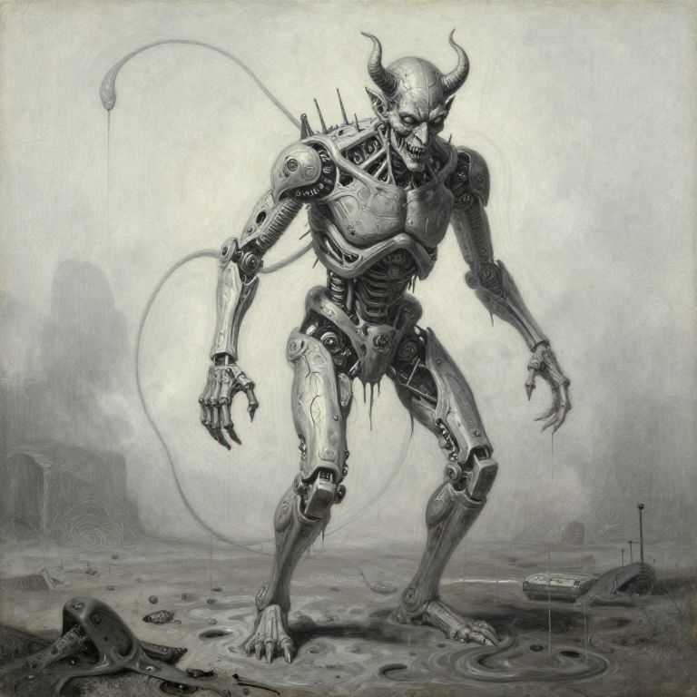 Highly detailed painting of a demon that is half-cyborg and half-sludge standing in a foggy, nihilistic doomscape. The figure features mechanical limbs and a skeletal structure fused with organic sludge elements, set against a bleak, desolate background. The artwork blends dark fantasy and sci-fi elements with a surreal and ominous atmosphere.