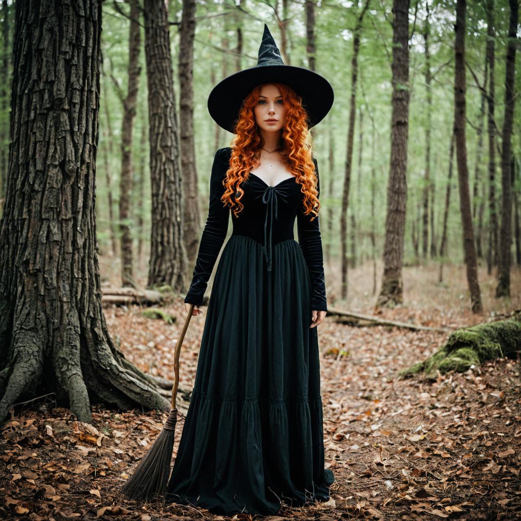 Witch dance costume,1girl, solo, hat, blonde hair, witch hat, long hair, outdoors, tree, standing, autumn leaves, skirt, long skirt, witch, looking at viewer, wavy hair, blurry, nature, blurry background, autumn, long sleeves, dress, full body, forest, purple skirt, day