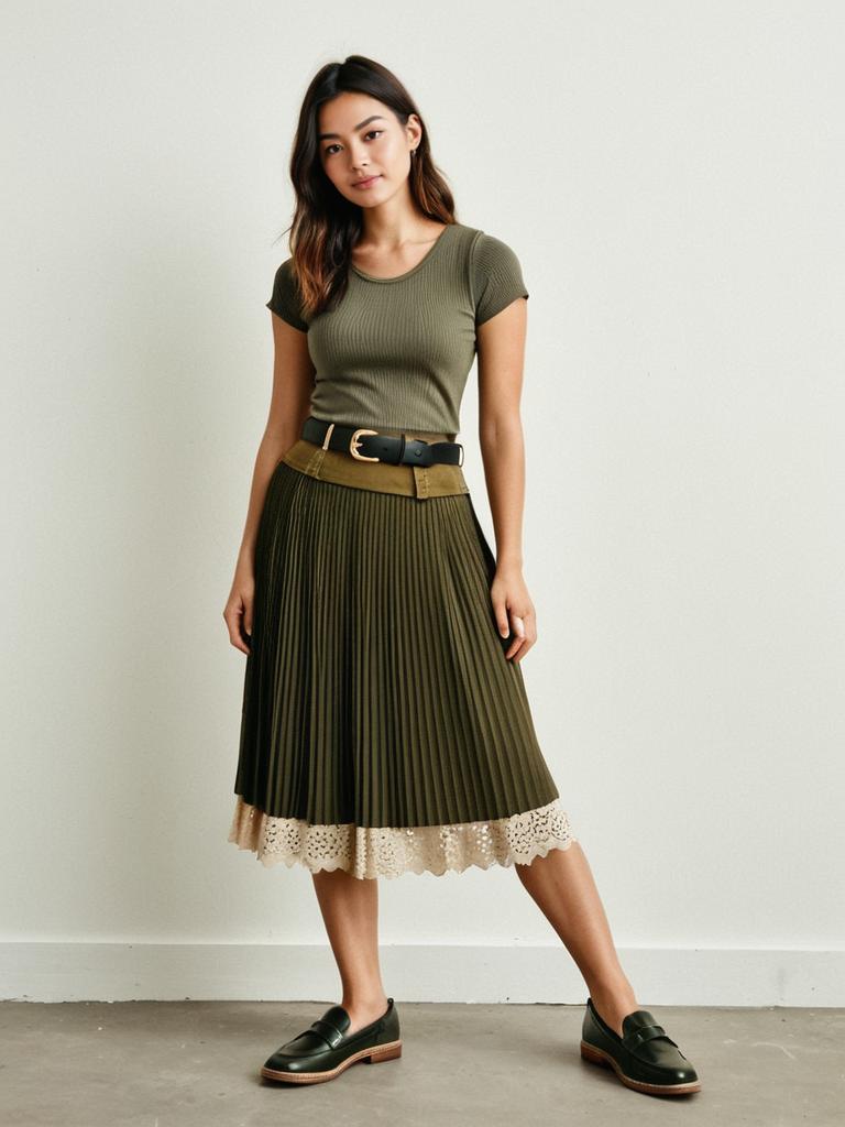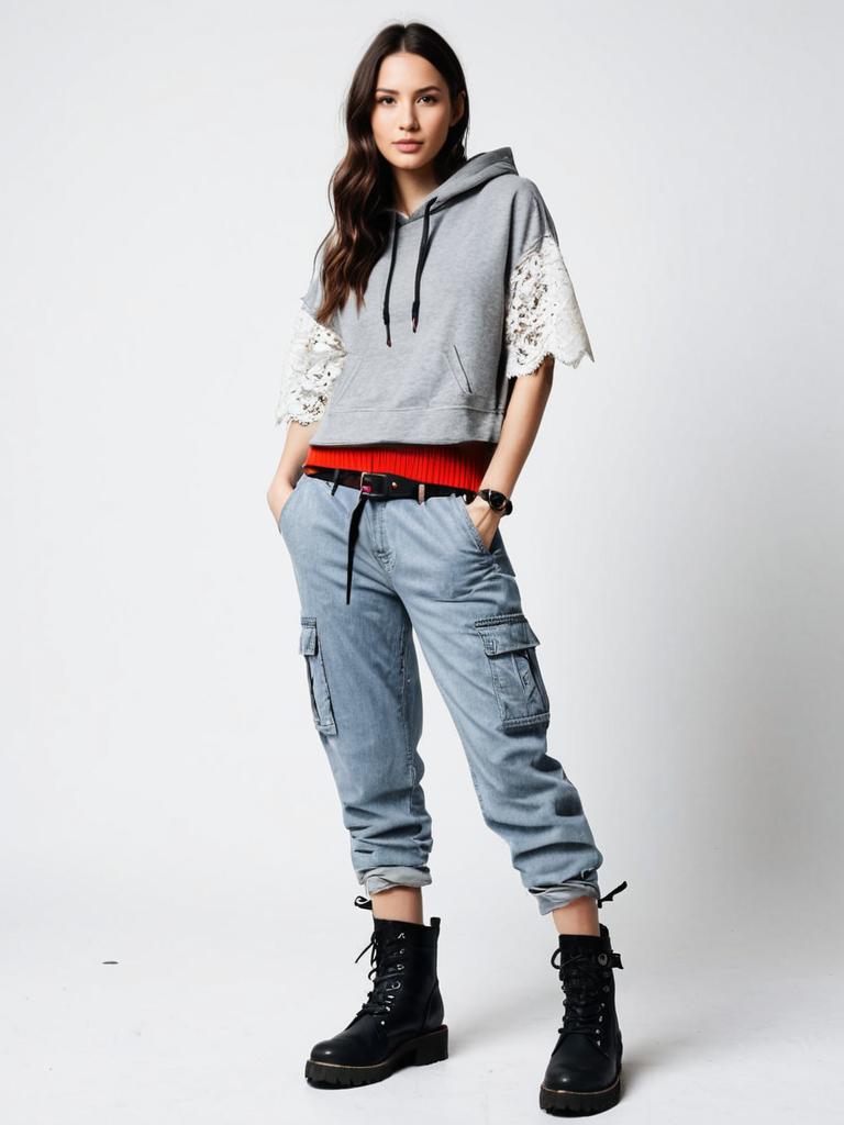 Woman, street style, rolled sleeve pastel pink button-down shirt, short sleeves, lace detailing on the hem, light-wash high-rise distressed denim jeans with ankle frays, skinny fit, light wash, black belt with gold buckle, black ankle boots, white studio background.