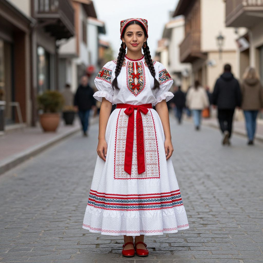 Photograph of a young woman standing on a cobblestone street in a European town. She has light brown skin, dark braided hair, and wears a white traditional Polish dress with red embroidery, a red ribbon at the waist, and red shoes. Her dress features puffed sleeves and a square neckline with intricate patterns. She also wears a red headband. The background shows blurred pedestrians and buildings with brown wooden facades. The street is lined with potted plants and shops, adding to the quaint, rustic atmosphere. The overall scene is bright and colorful.