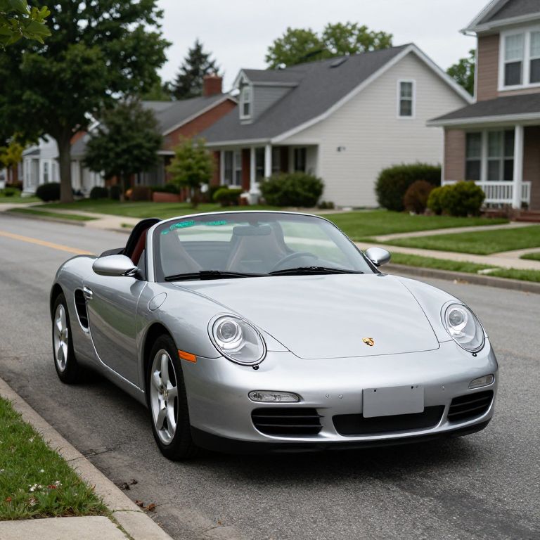 Silver Porsche Boxster 2dr Roadster from 2001 is parked prominently in the center of a suburban street, showcasing its sleek design and iconic emblem, with a green dealership sticker visible through the windshield, indicating its availability at Meccanic Shop North Inc. in North Salem, New York.