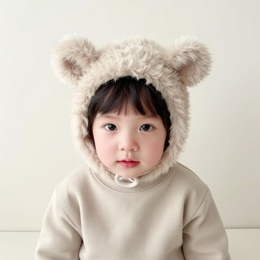 Photograph of a young Asian child with fair skin, round face, and dark brown eyes, wearing a beige, ribbed, long-sleeve sweater and a fluffy, white bear-eared hood. The hood has soft, textured fur and small, round bear ears. The child's black hair peeks out from beneath the hood, and they have a neutral expression. The background is a plain, white wall, creating a clean, minimalistic look. The lighting is bright and even, highlighting the child's facial features and the texture of their clothing.