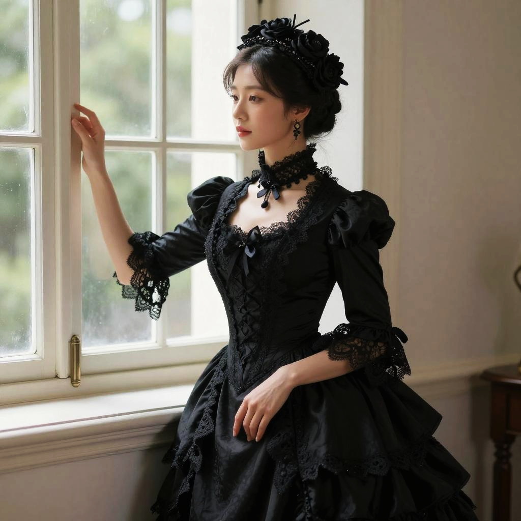 Photograph of an East Asian woman with fair skin and dark hair, styled in an elegant updo adorned with a black floral hairpiece. She wears a Victorian-style black lace dress with puffed sleeves, a high collar, and intricate lace detailing. Her right hand gently touches a white-framed window, through which soft daylight filters, illuminating her profile. The background features a white wall with a wooden baseboard and a blurred green outdoor view. She gazes thoughtfully out the window, exuding an air of grace and refinement.