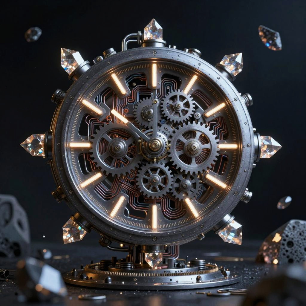 Time travel machine drawing as a conceptual art piece, blending mechanical and organic elements, glowing crystals embedded in metallic frame, interlocking gears and circuits, set against a dark, starry void with floating time fragments