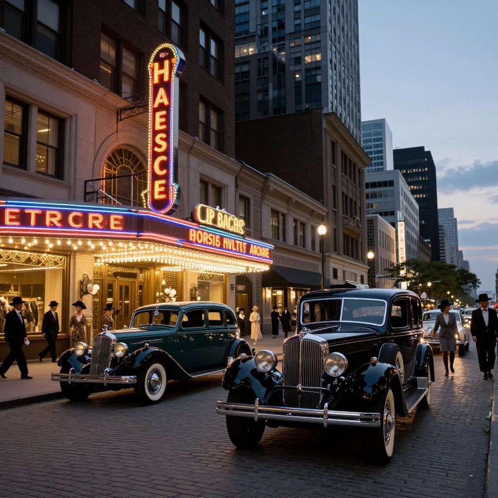Twenties cityscape at dusk showing classic automobiles on cobblestone streets, illuminated storefronts with neon signs, and elegantly dressed pedestrians in hats and suits, capturing the roaring twenties' dynamic urban life and glamour.