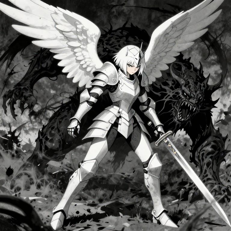Ukiyo-E a war, battlefield, fantasy, medieval, an armored female angel with a helm and short white hair and white wings slaying a monster of shadows with her sword,