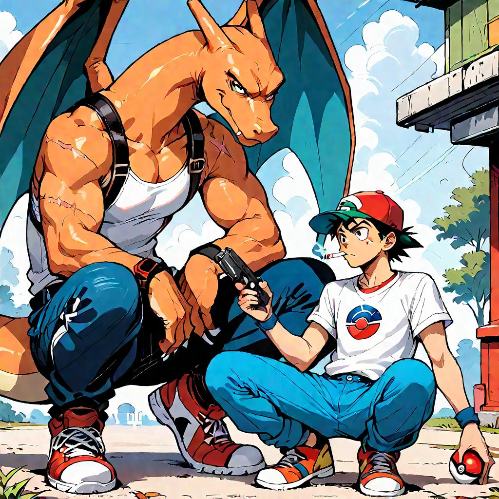 Score_8_up, score_7_up, source_anime, handsomize, outdoors, 2boys, ash ketchum, pokemon, pokeball, cigarette, tattoo, thug, holding gun, handgun, drugs, squatting, muscular, biceps, red baseball cap, topless male, stitches, scars, blue pants, pikachu, charizard
