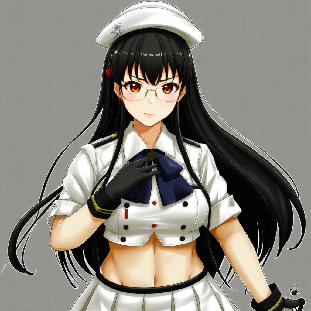 Choukai kai ni (kancolle), kantai collection, 1girl, red eyes, glasses, rimless eyewear, long hair, black hair, hair ornament, large breasts, cleavage, navel, black gloves, pleated skirt, mini hat, beret, headgear, midriff, by artist sekira ame, anime