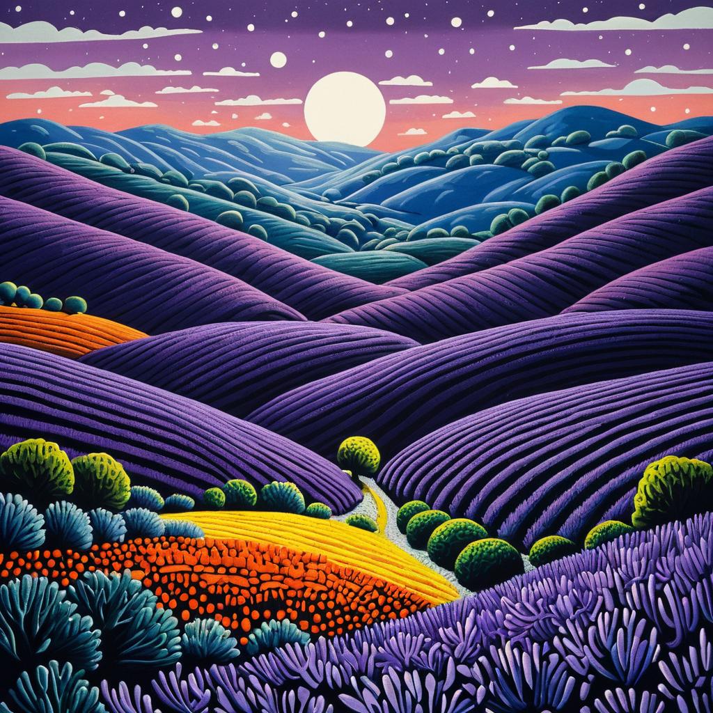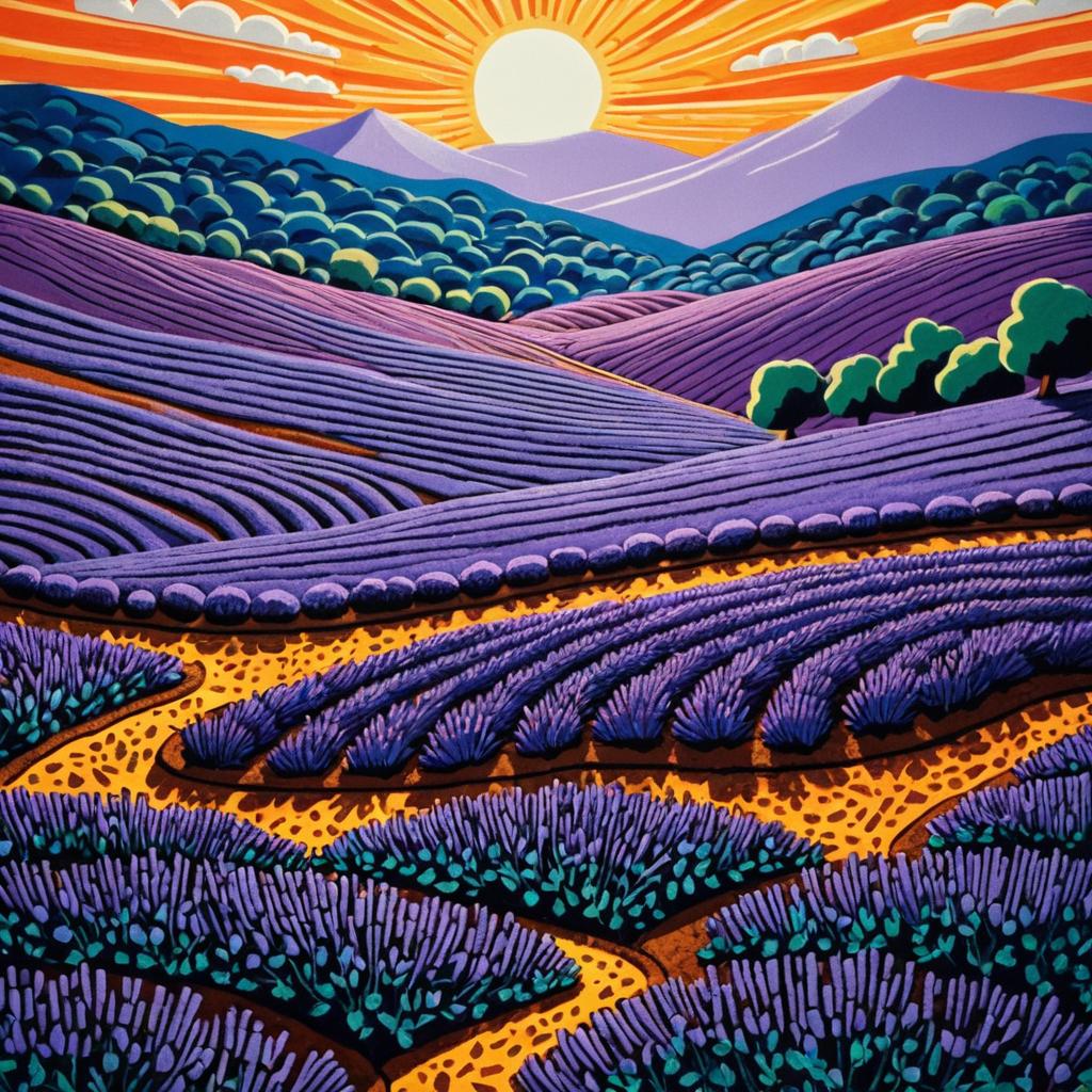 A highly detailed 3D rendered surreal landscape featuring rolling lavender hills under a vibrant yellow sun. The scene includes bold, stylized green trees and a vivid sky with layered circular patterns and pink clouds, evoking an alien yet magical atmosphere inspired by Henri Matisse and other modern artists.
