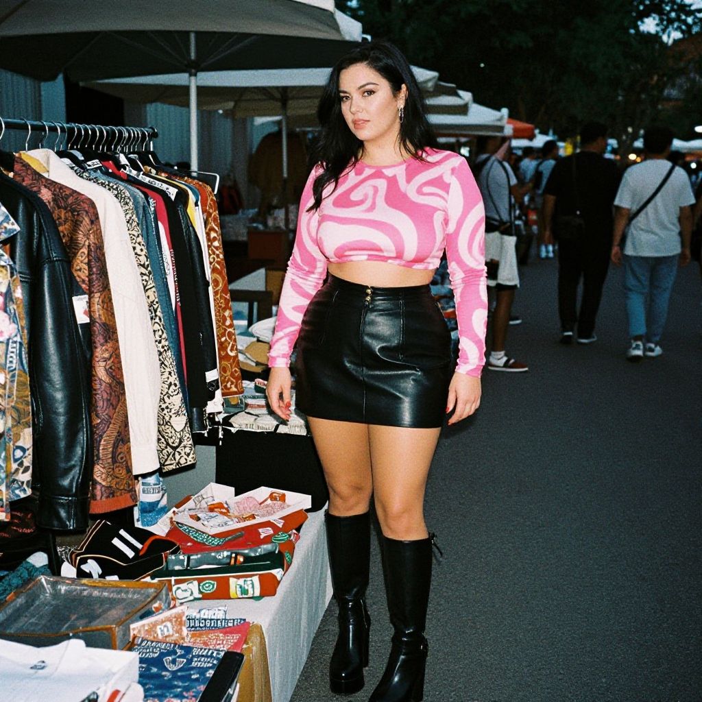 Photograph of a curvy woman with dark hair, wearing a pink, white abstract crop top, black leather skirt, and knee-high boots, standing