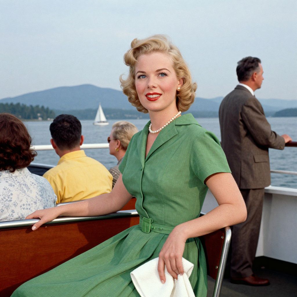 In this vibrant 1950s magazine painting, a beautiful woman with blonde short hair and striking blue eyes exudes elegance and happiness as she rides a ferry boat over the Puget Sound. She is adorned in a stylish green dress with a matching belt, accentuated by a delicate pearl necklace and red lipstick that adds a pop of color to her face. The woman's posture, with one hand resting on the railing and the other holding a white towel, suggests a relaxed and content demeanor. In the background, other passengers can be seen enjoying the view, with one man in a yellow shirt and another in a brown suit standing near the railing. The serene landscape of mountains and a distant sailboat adds to the tranquil atmosphere of the scene. The overall composition is balanced, with the woman as the central figure, and the ferry boat and passengers creating a harmonious blend of elements that capture the essence of a leisurely journey in the 1950s.