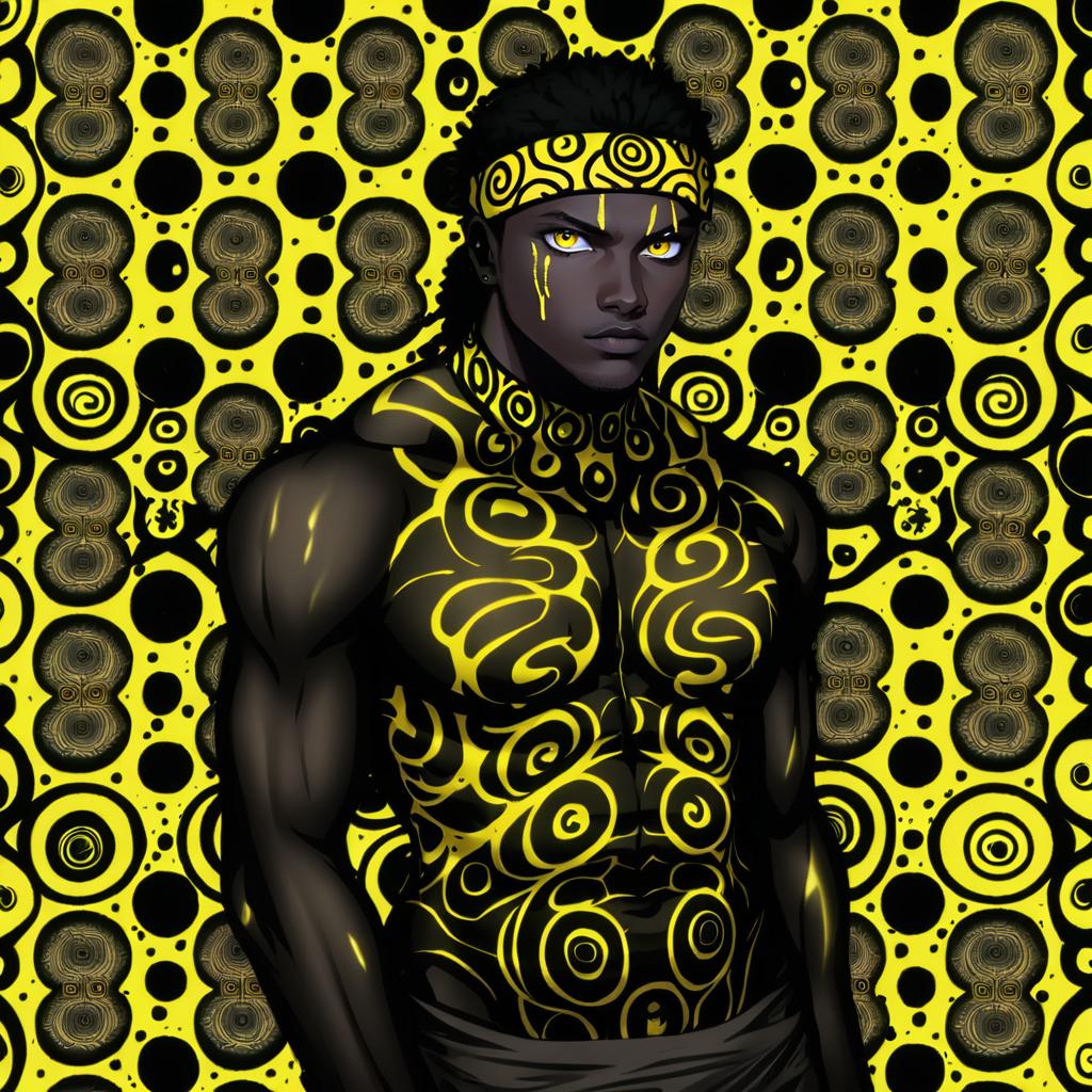 Digital artwork of a dark-skinned male anime character with black hair and glowing yellow eyes. He is topless, showcasing intricate yellow swirl tattoos covering his upper body. The character wears a matching yellow headband. The vibrant background features a repetitive yellow and black circular pattern, complementing the character's tattoo design. The art style is dynamic and detailed, evoking a strong and mystical presence.
