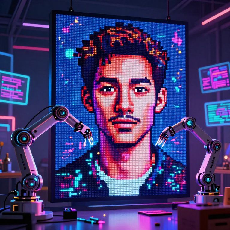 Pixelate image generator concept art featuring a robotic artist creating pixelated portraits, robotic arms assembling millions of tiny glowing pixels, neon-lit futuristic art studio filled with holograms, dynamic pixel breakdown effects, rich in detail and vivid colors, high-resolution digital painting.