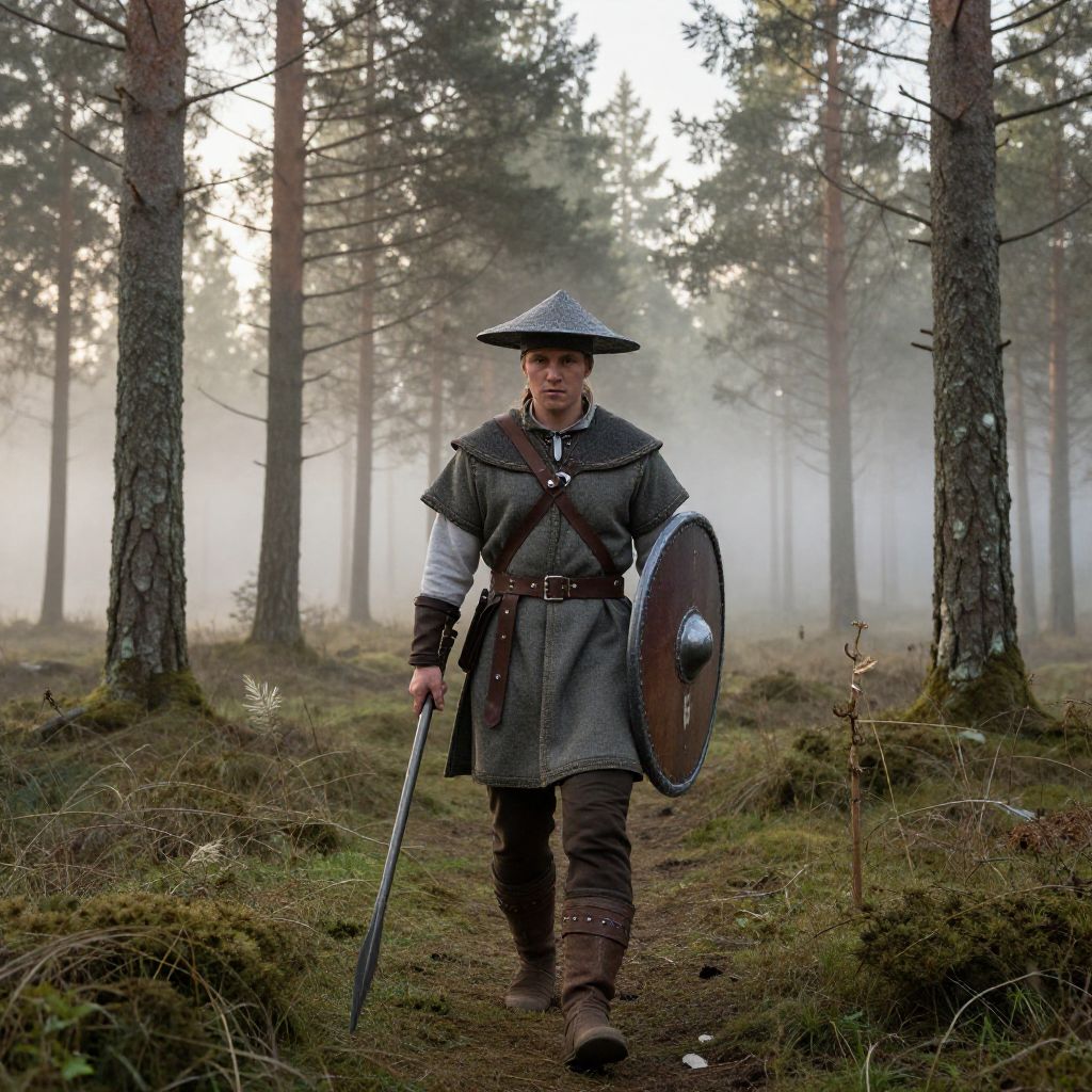 A person dressed in a Viking costume, featuring a layered tunic, leather belt, and a conical hat, walking through a misty Scandinavian forest with a shield and spear, surrounded by tall pine trees and soft morning light.