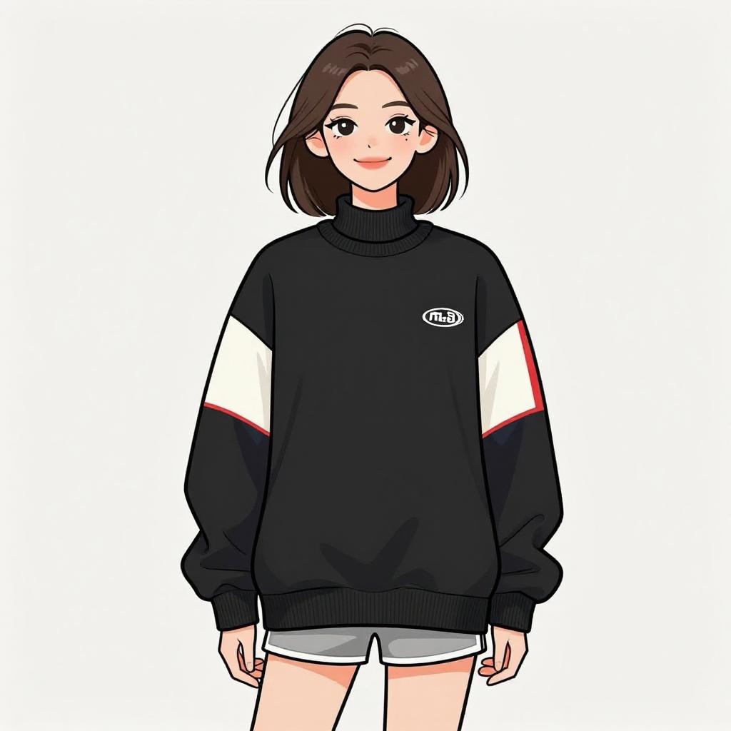 This is a digital anime-style drawing of a young woman with fair skin and straight, shoulder-length brown hair. She has large, expressive brown eyes and a subtle smile. She is wearing a black, long-sleeved, turtleneck sweater with white and red striped sleeves and a small white logo on the left chest. She pairs the sweater with white, short athletic shorts. The background is plain white, making her the focal point. The drawing has a clean, vibrant, and slightly cartoonish aesthetic, typical of modern anime art.