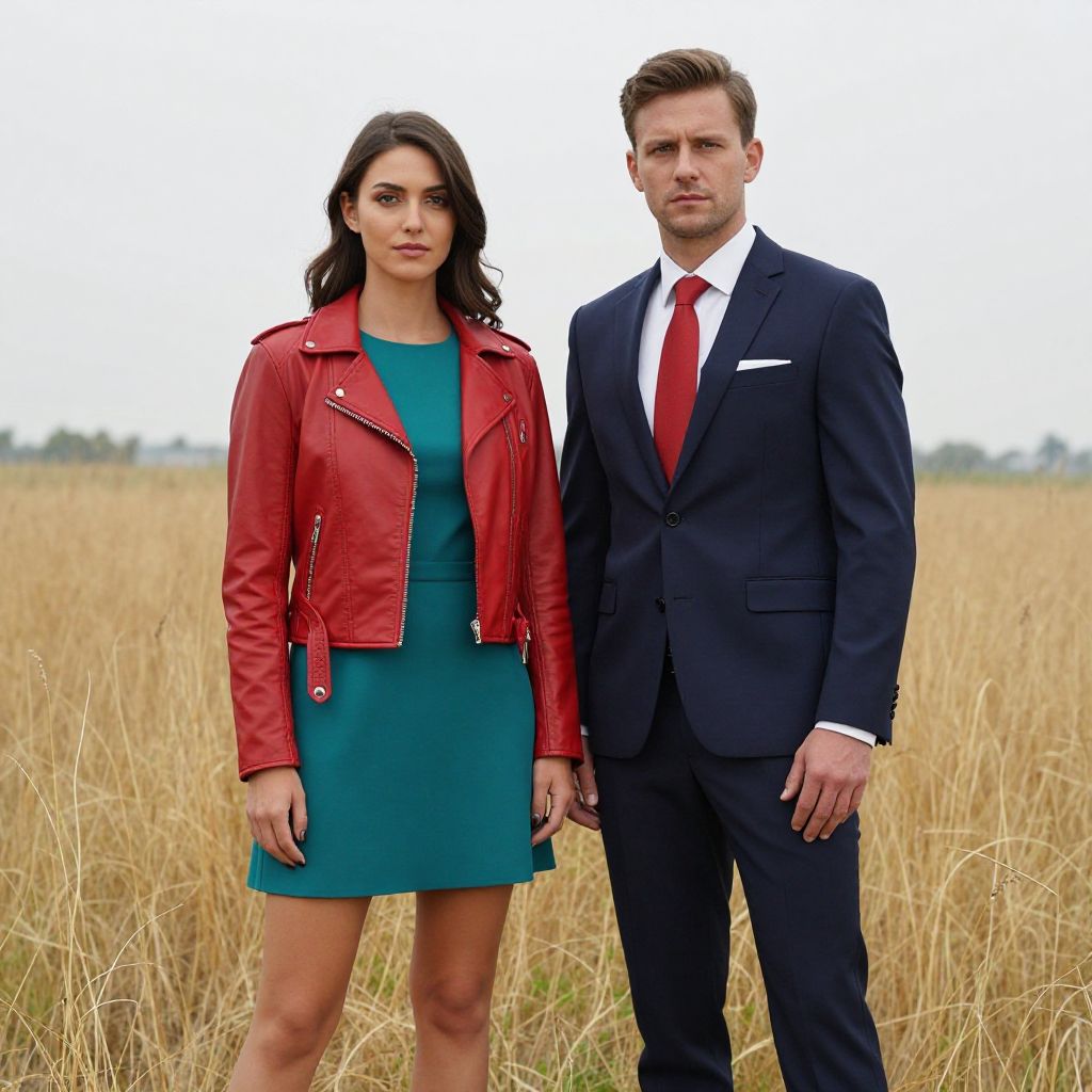 Two individuals stand side by side in a field of tall golden grass, with the woman wearing a striking red leather jacket over a teal dress and the man dressed in a sharp navy suit with a red tie and white pocket square, both gazing intently toward the camera against a muted sky backdrop.