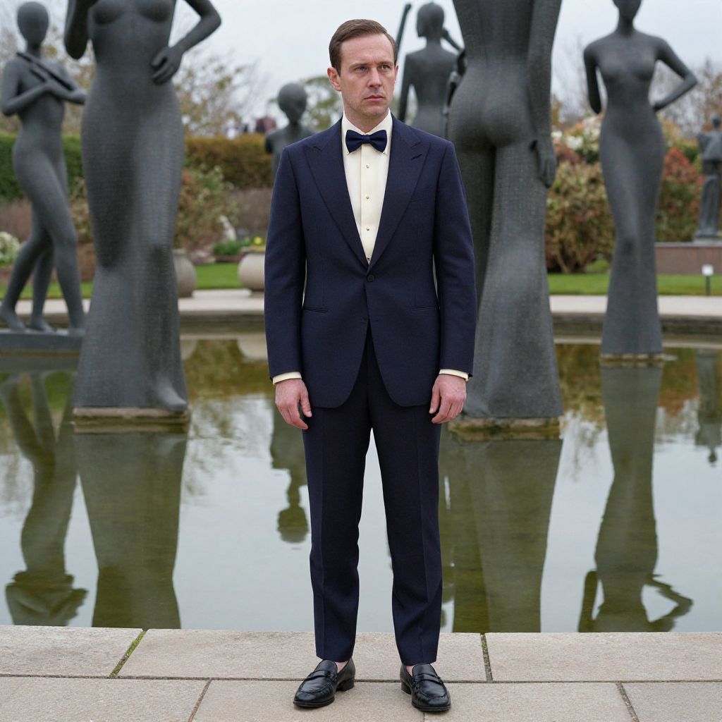Photograph of a Caucasian man with fair skin, short brown hair, and a serious expression, standing in front of a row of black, abstract statues. He is dressed in a dark navy blue tuxedo with a white shirt and black bow tie, and black dress shoes. The statues are positioned around a reflective pond, with greenery and trees in the background. The man stands on a stone-paved area, centered in the foreground, with the statues and pond blurred slightly in the background. The overall atmosphere is formal and elegant.