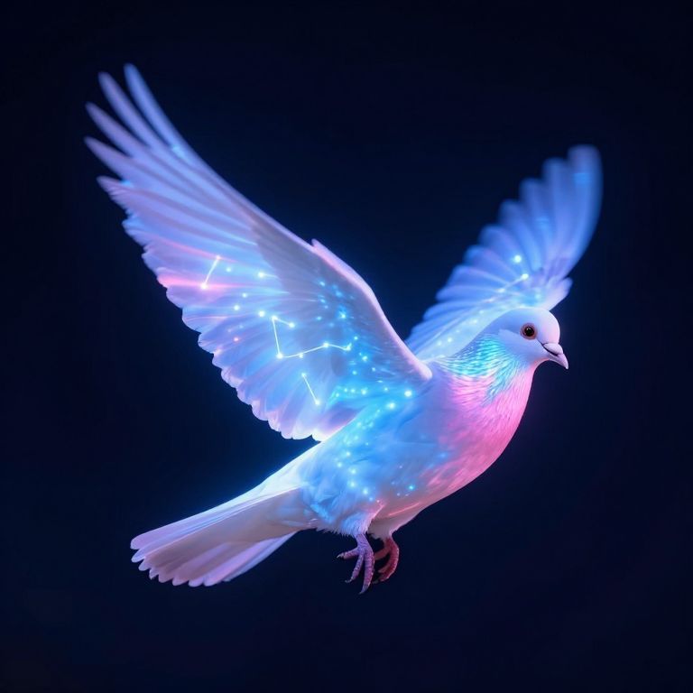 A luminous pigeon bathed in ethereal blue and pink hues soars against a deep, velvety backdrop, its feathers glowing like neon constellations, defying the boundaries of natural light and color.