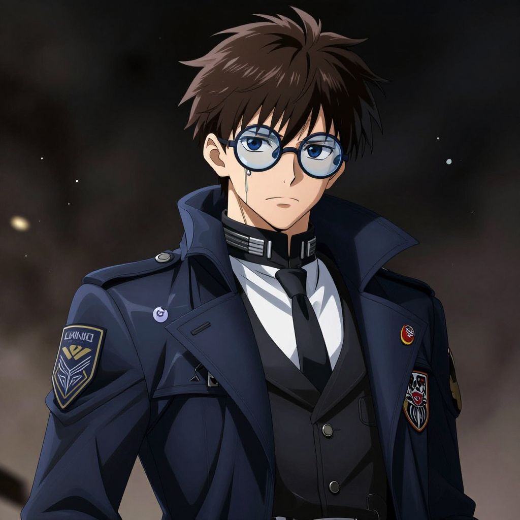 Anime-style digital drawing of a serious young man with brown hair, glasses, and blue uniform jacket, featuring badges, against a dark, starry background
