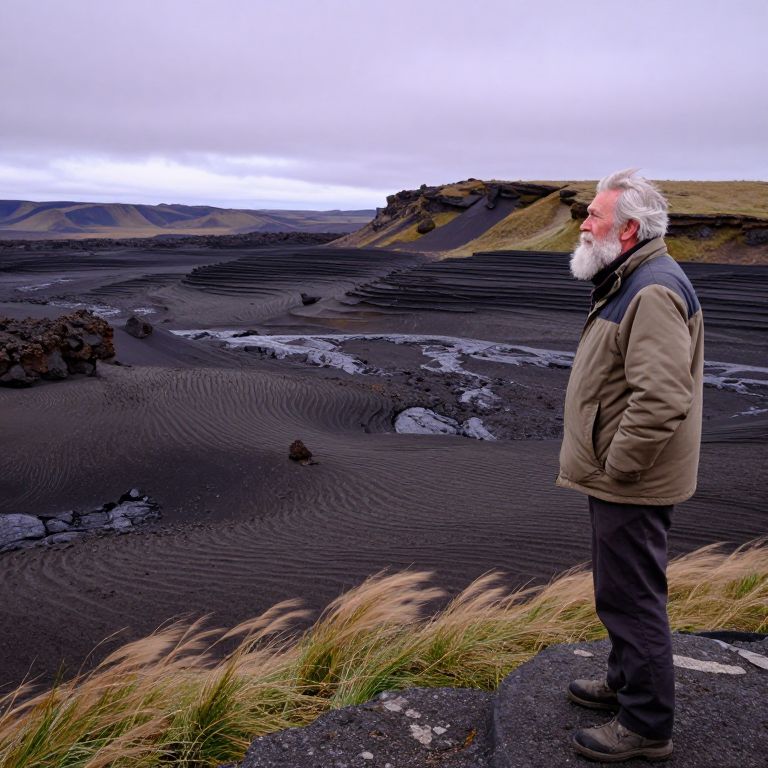 Photograph of an elderly white man with a full white beard and glasses standing in profile, gazing at a vast, rugged black lava field with rippled textures and scattered rocks. He wears a brown jacket, black pants, and dark shoes, standing on a grassy patch in the foreground. The background features layered, dark volcanic hills under an overcast sky. The colors are predominantly dark with pops of green from the grass and a pale blue sky. The man's contemplative stance contrasts with the stark, natural landscape.