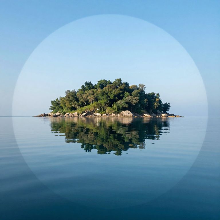 Through a circular portal, a serene island floats above a tranquil sea, its reflection mirrored perfectly beneath the waterline, defying gravity and creating a dreamlike, symmetrical world where land and sea converge in impossible harmony.
