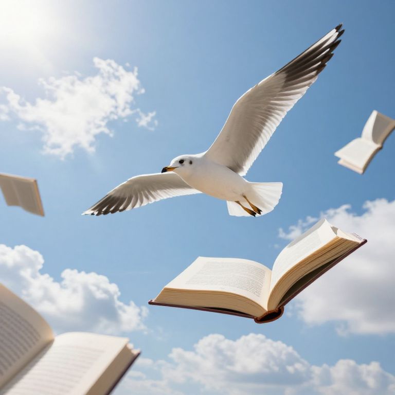 Books flutter through the sky, their pages flipping open to reveal stories of flight, as a seagull soars gracefully beneath a sunlit blue expanse dotted with fluffy clouds.