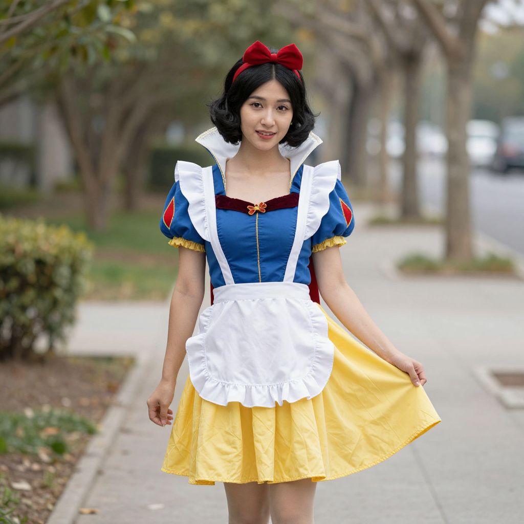 Photograph of an Asian woman in a Snow White costume with a blue bodice, yellow skirt, white apron, red bow, and black hair