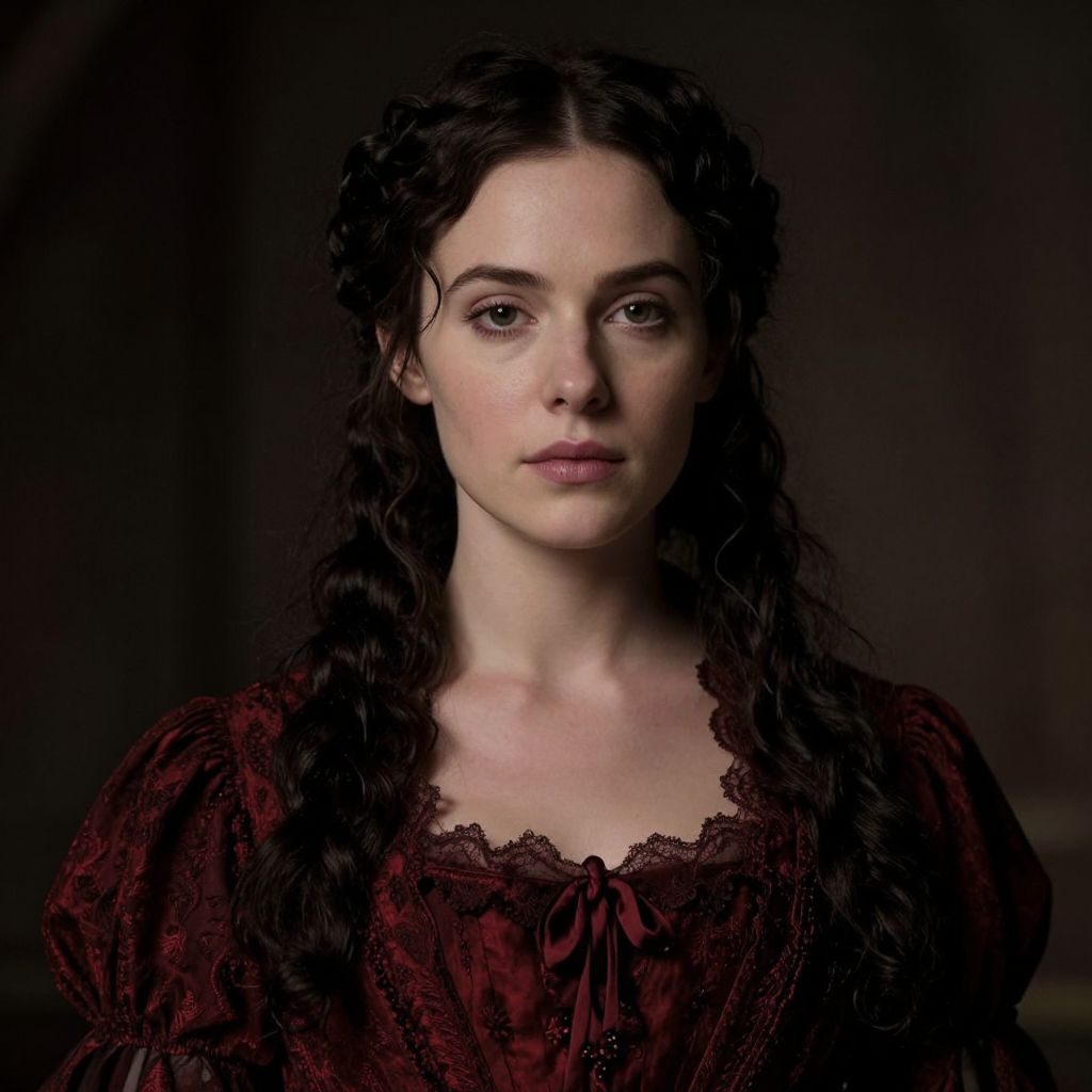 Photograph of a young woman with pale skin and dark, wavy hair parted in the middle, wearing a deep red, lace-trimmed, Victorian-style dress with puffed sleeves and a bow at the neckline. She has large, dark eyes, a subtle nose, and full lips. The background is dark and blurred, making her the focal point. The lighting is soft, highlighting her face and creating a slightly shadowed effect around her. Her expression is neutral, with a slight hint of seriousness. The overall mood is somber and classic, evoking a historical or Gothic aesthetic.