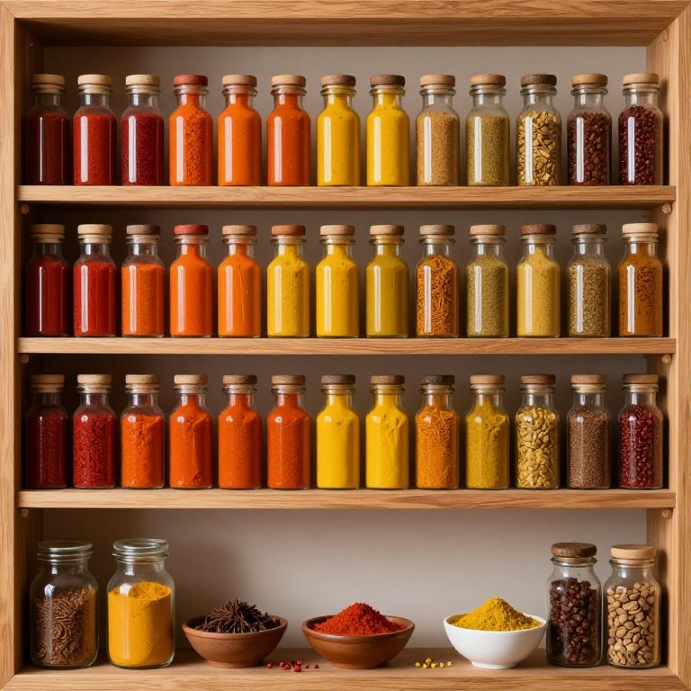 Colorful Spice Bottles on Wooden Shelves