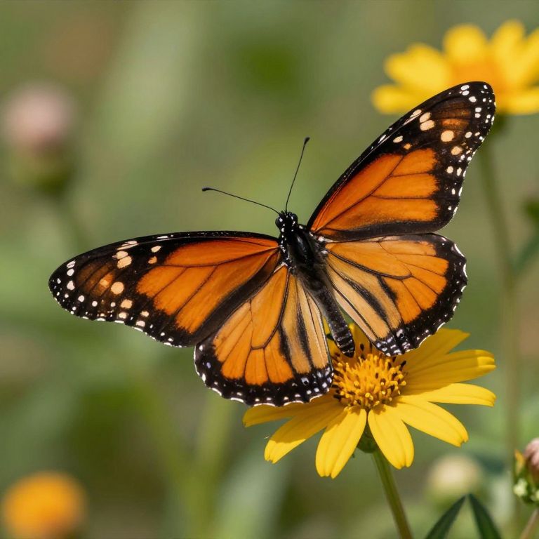 Vibrant monarch butterfly gracefully perched amidst a cluster of golden sunflowers, its intricate orange and black wings adorned with delicate white spots, contrasting beautifully against the soft green foliage and blurred floral background.